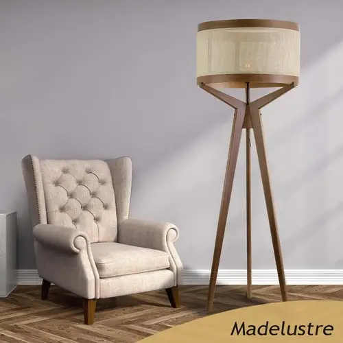Produzida em madeira com acabamento castanho a luminaria de chão Navi se destaca pela suavidade em seu acabamento.